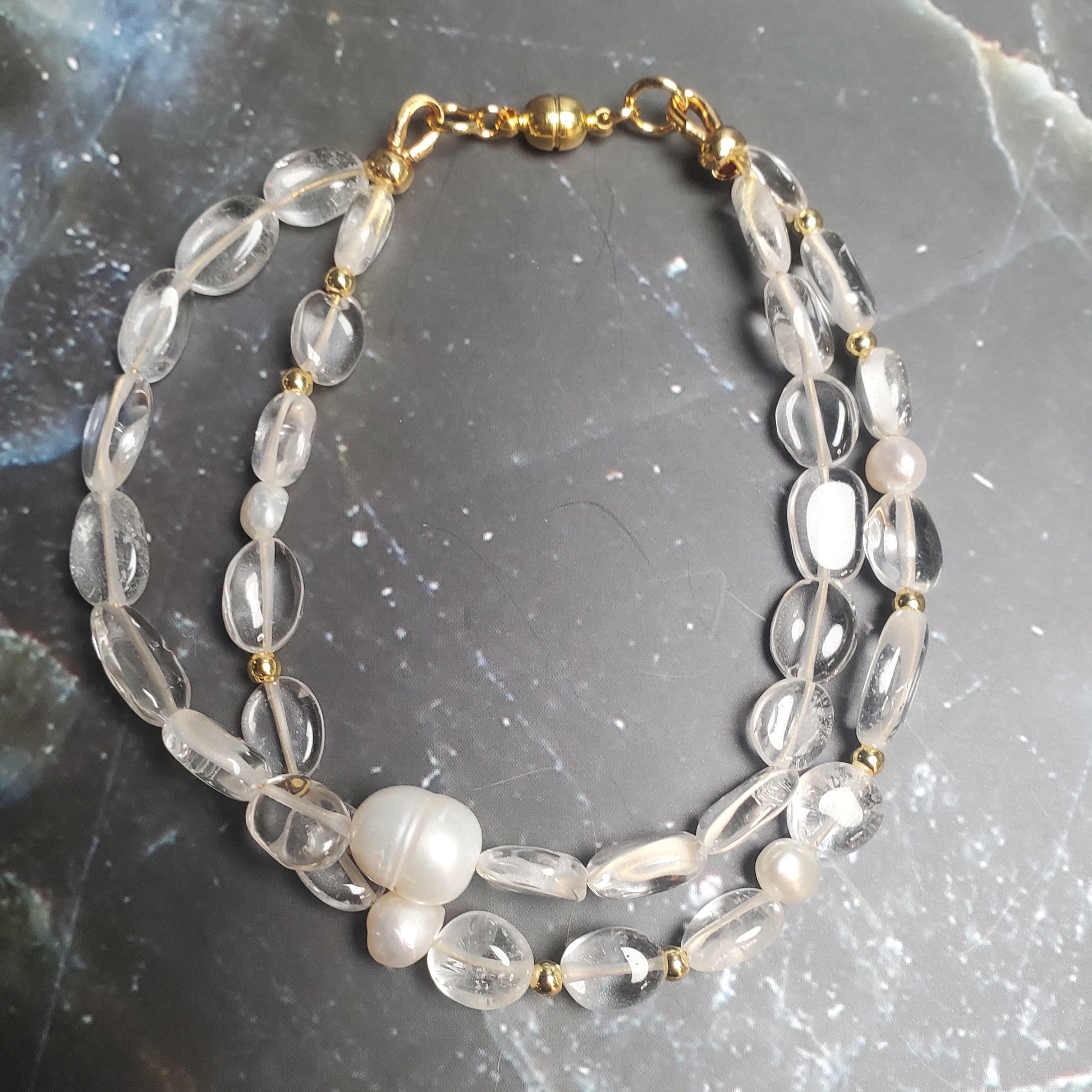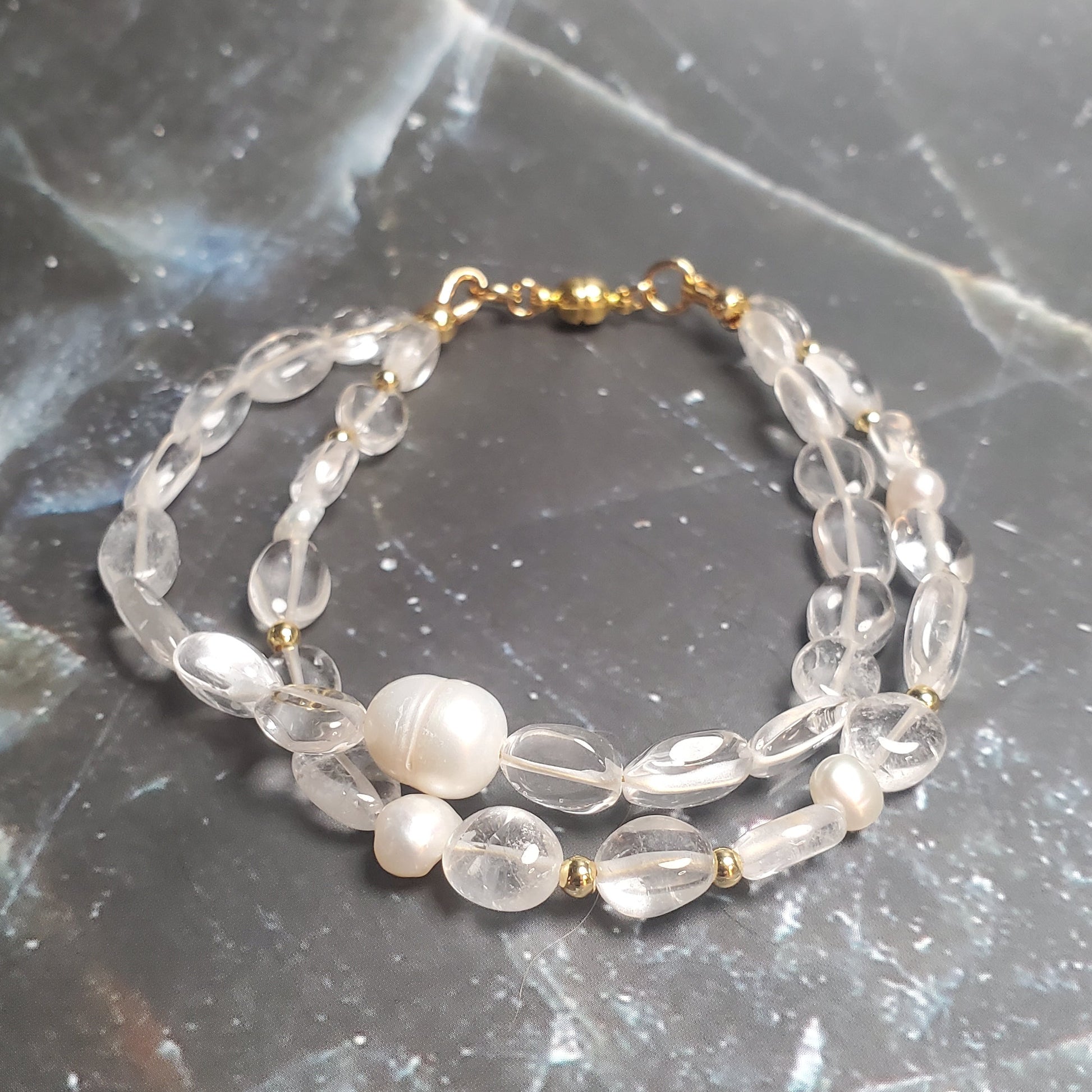 Elevate your style with this elegant gemstone bracelet, thoughtfully crafted in a refined double-strand design featuring luminous Clear Quartz pebbles and lustrous Freshwater Pearls. Warm brass accents add subtle sophistication, while a striking Baroque Pearl serves as a captivating focal point.
