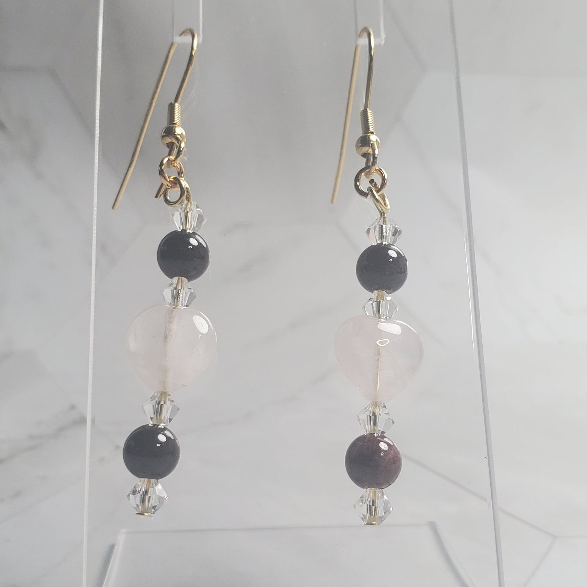 These romantic gemstone earrings are thoughtfully crafted with authentic Garnet, Swarovski crystal and delicate heart-shaped Rose Quartz, creating a graceful dangle design that feels both timeless and meaningful. The rich red tones of Garnet pair beautifully with the soft blush of Rose Quartz, offering a balanced look that suits any occasion.