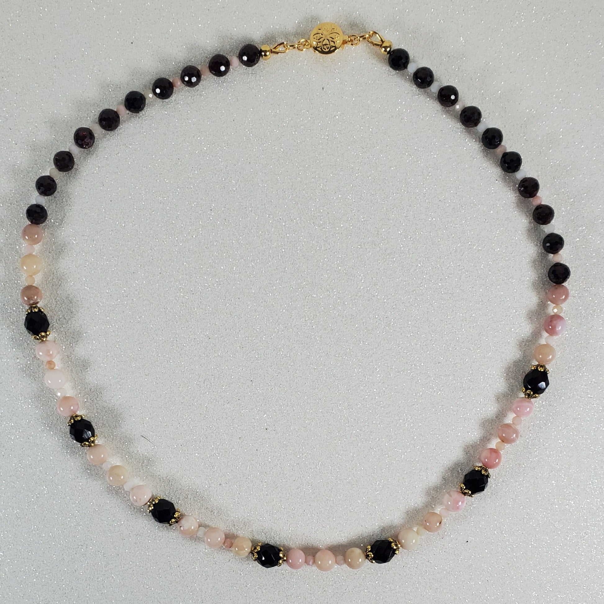 This exquisite gemstone necklace features genuine Pink Peruvian Opal harmoniously paired with finely faceted Garnet stones, accented by warm brass elements for a touch of refinement. Measuring 20 inches in length and secured with a classic box clasp, it blends elegance with comfort for effortless wear.