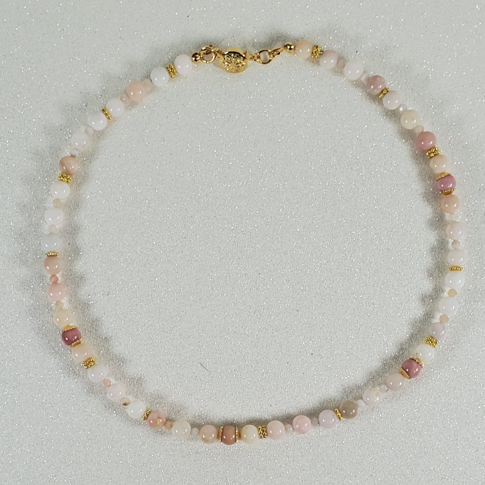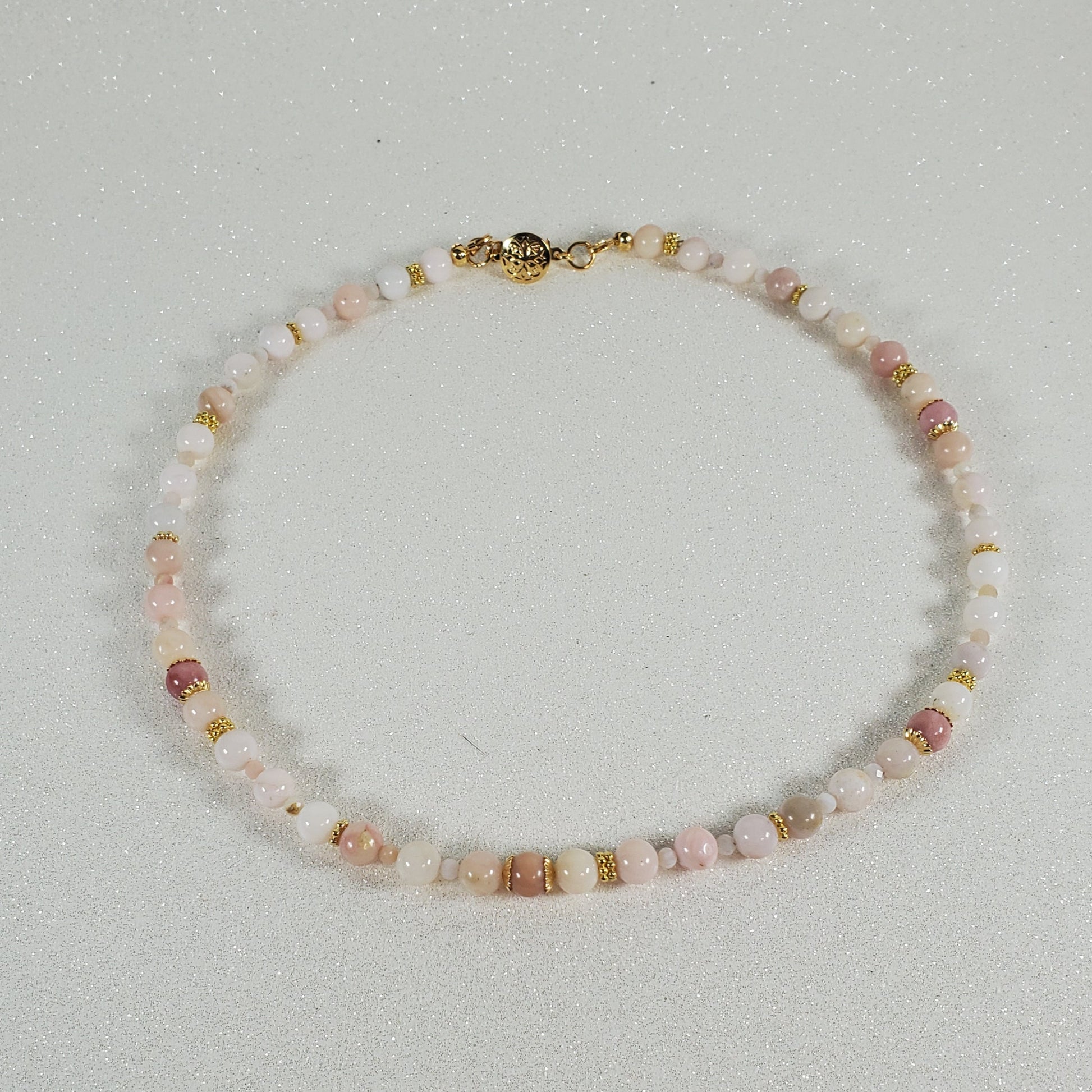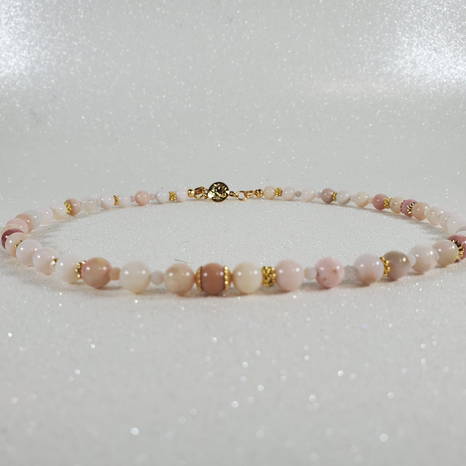 This elegant gemstone necklace features genuine Pink Peruvian Opal gemstones, each naturally unique in color and shape, enhanced by subtle brass accents that lend a warm, luxurious finish. Measuring 16 inches, the choker-style design rests gracefully around the neck, secured with a refined box clasp for both beauty and practicality.