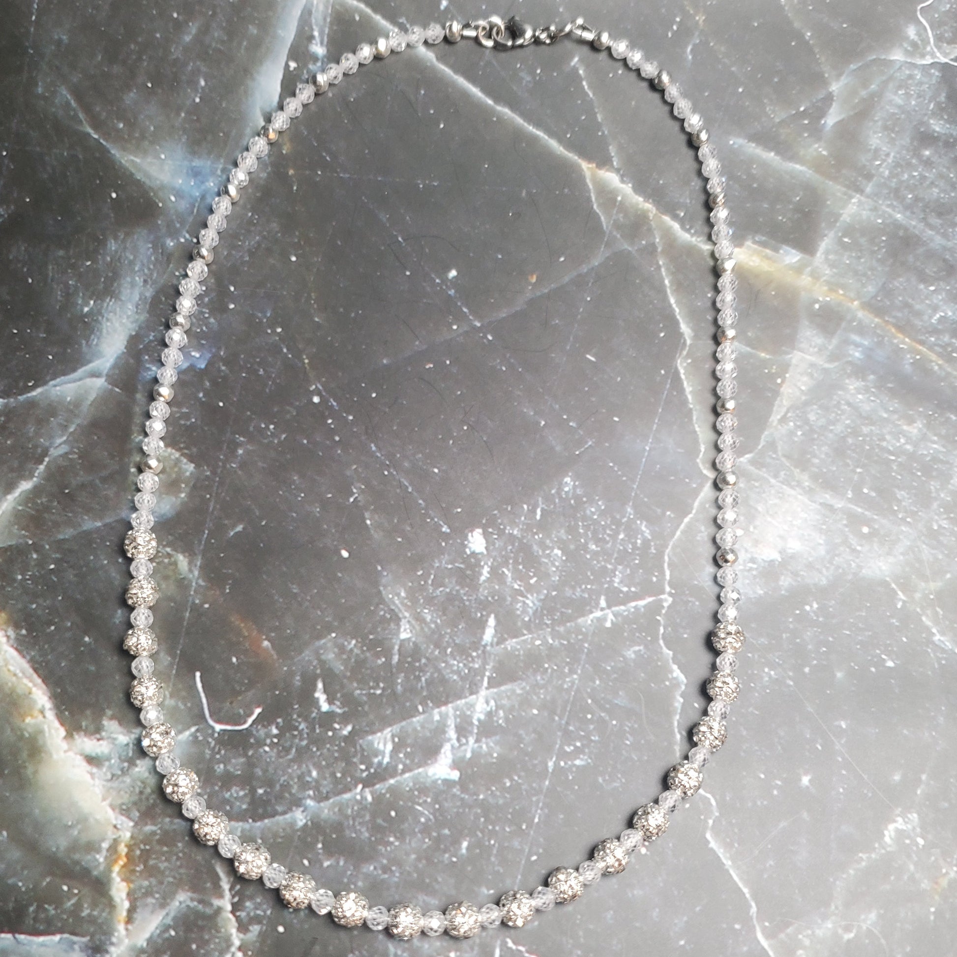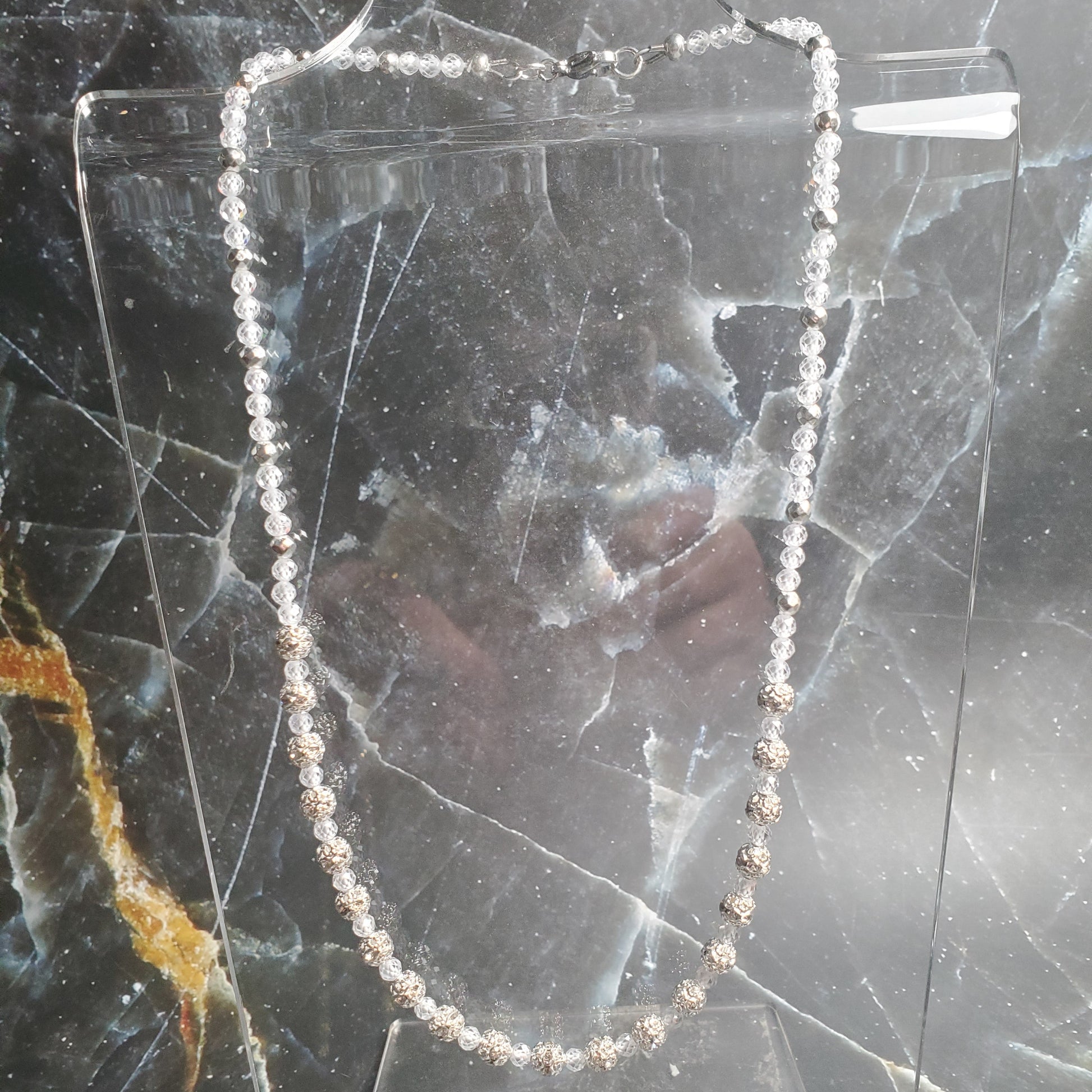 This refined gemstone necklace highlights the timeless brilliance of genuine 4mm Zircon, accented with sleek metallic Hematite and intricately detailed Zircon-encrusted pavé beads. Beyond its polished elegance, this design carries meaningful spiritual symbolism, blending beauty with intention.