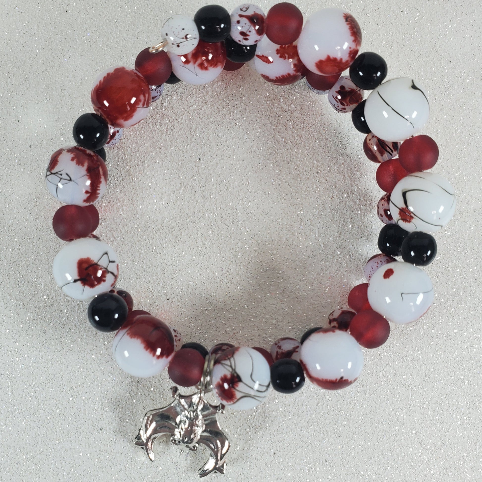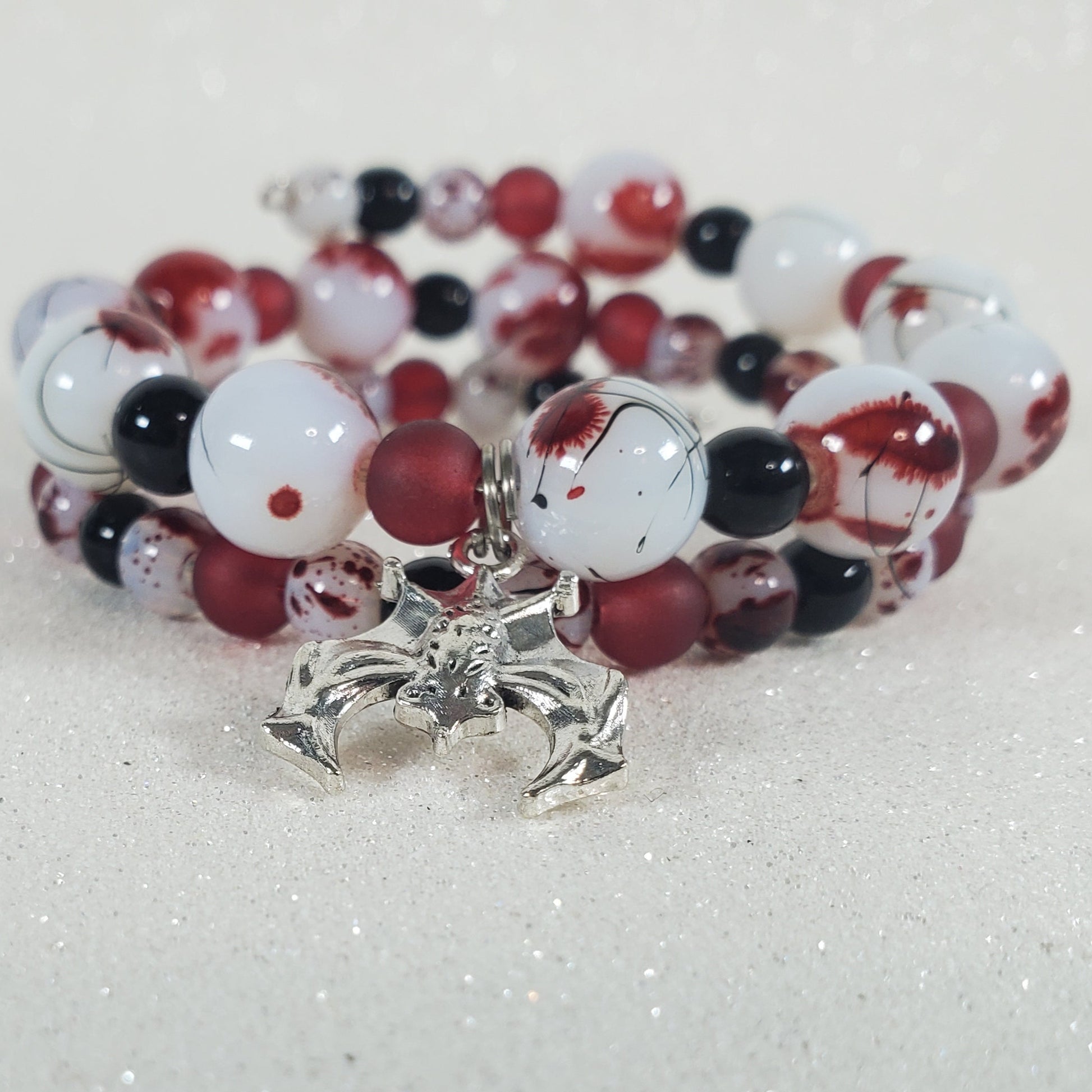 Make a bold statement this season with this daring Halloween bracelet, featuring striking glass spatter beads paired with a detailed pewter vampire bat charm. Designed on memory wire, the bracelet comfortably adjusts to fit wrist sizes from 5.5 to 8 inches, offering both a secure and flexible fit.