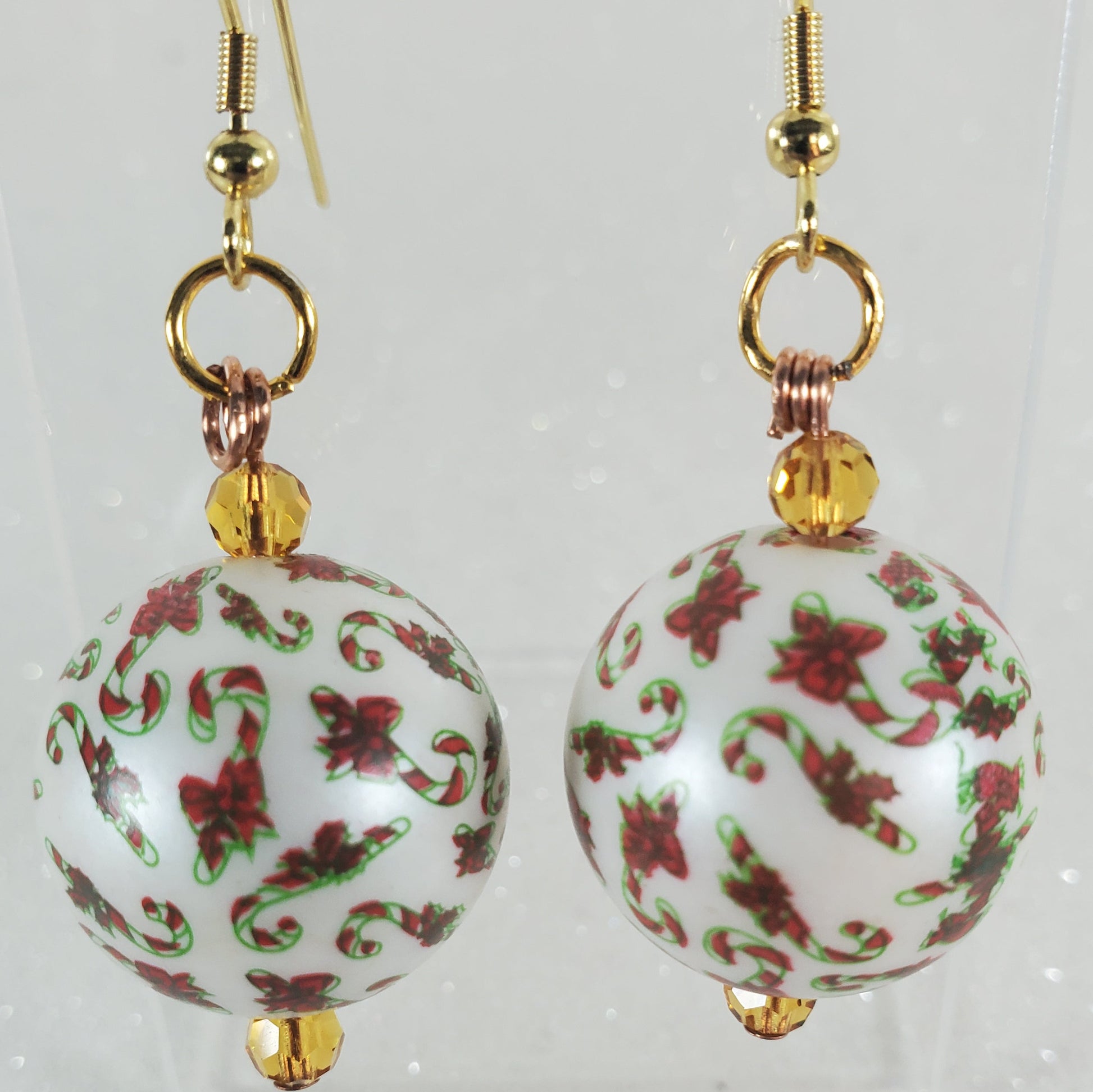 Celebrate the season in full sparkle and joy with these handcrafted holiday earrings, featuring vibrant 20mm acrylic beads adorned with cheerful candy canes and festive red bows. Each glossy bead catches the light beautifully, blending the sweetness of tradition with the joyful spirit of the holidays.